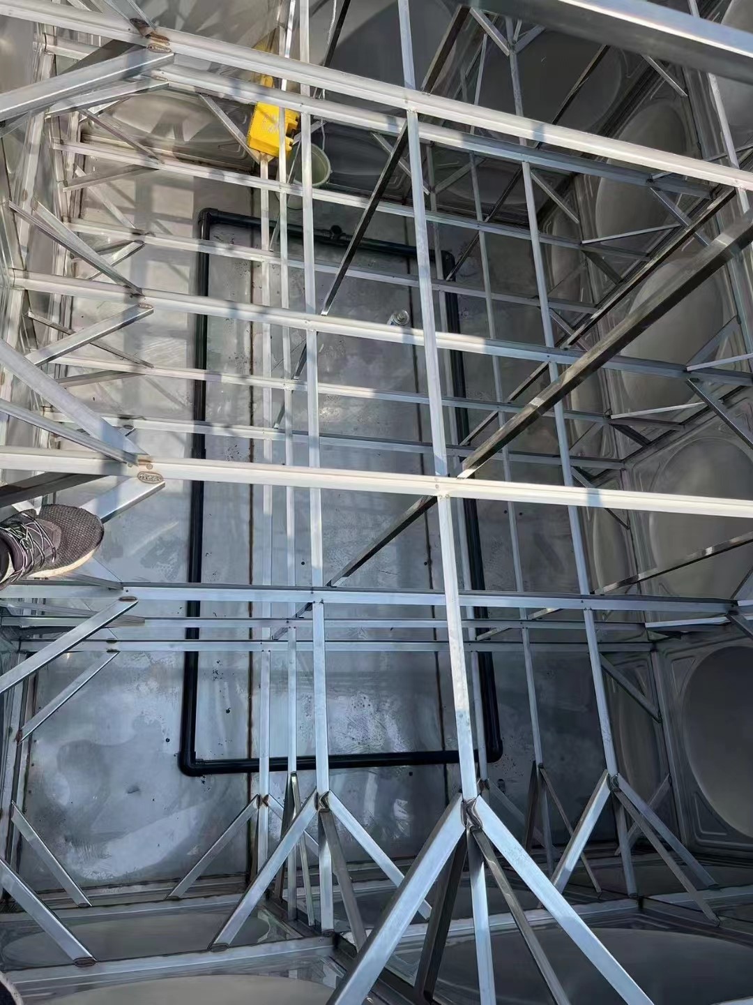 4、不銹鋼水箱的支架采用優(yōu)質(zhì)圓鋼焊接而成,支架與箱體之間通過螺栓連接。