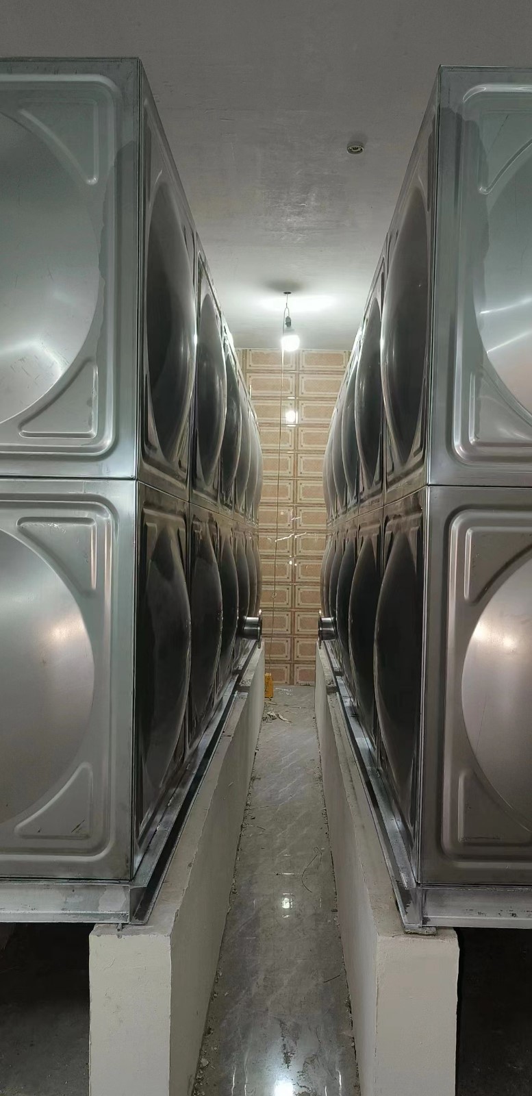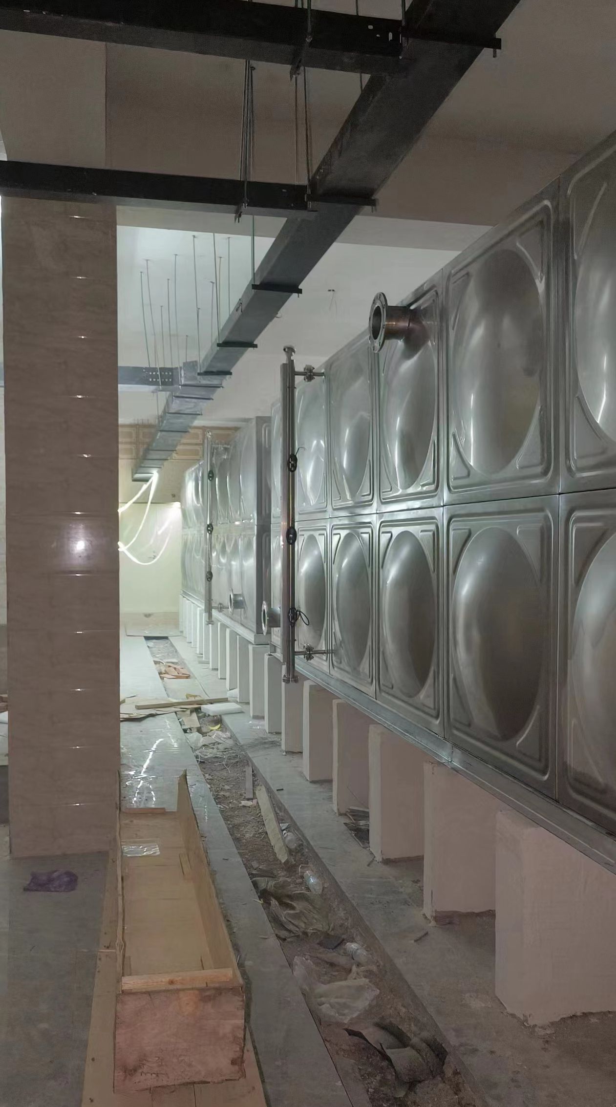 我司承接的河北省唐山市玉田縣潤城府地下室不銹鋼生活水箱項目,已安裝試水完畢。不銹鋼焊接水箱,是指容器本體用不銹鋼板沖壓帶一定凹凸形狀,使之鋼度大大提高,再焊接成薄殼箱體的新型水箱,是目前國內較先進、較美觀、較適用的水箱,其結構精巧、合理、先進,用材省,可在民用及工業(yè)建筑中廣泛采用,是儲存、調節(jié)用水的理想設備。